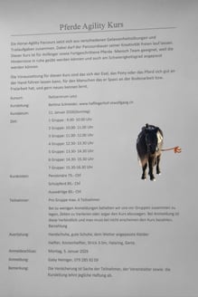 Ein Horse-Agility Parcours setzt sich aus verschiedenen Gelassenheitsübungen und Trailaufgaben zusammen. Dabei darf der Parcoursbauer seiner Kreativität freien Lauf lassen. Dieser Kurs ist für Anfänger sowie Fortgeschrittene Pferde -Mensch Teams geeignet, weil die Hindernisse in Ruhe geübt werden können und auch am Schwierigkeitsgrad angepasst werden können.