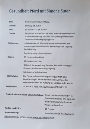 Der Kurs soll als Fortsetzung zum Kurs im Januar dienen, es dürfen jedoch auch Personen teilnehmen, welche im Januar nicht dabei waren. Corinne wird individuell auf den Ausbildungsstand des Pferdes und des Longenführers eingehen.